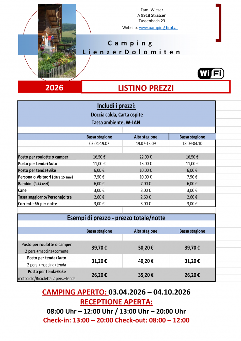 Per le PRENOTAZIONI FISSE di durata inferiore a 3 notti, l’intero soggiorno dovrà essere pagato in anticipo, più una commissione di elaborazione di 20 euro.